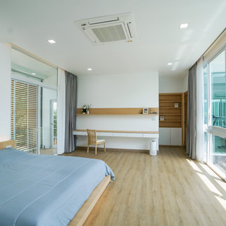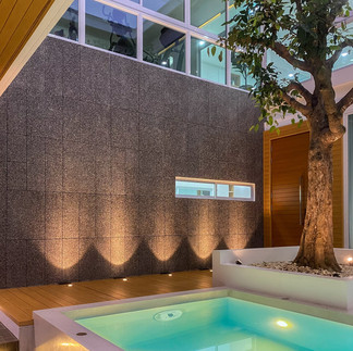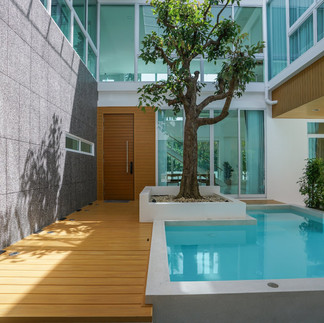มีการวางสระว่ายน้ำไว้กลางบ้าน เพื่อให้ได้รับไอเย็นของน้ำที่พัดผ่านเข้ามา ช่วยให้บ้านเย็นสบาย มีต้นไม้เป็นประธานกลางบ้าน ไม่ว่าจะอยู่มุมไหนของบ้านก็สามารถมองเห็นได้