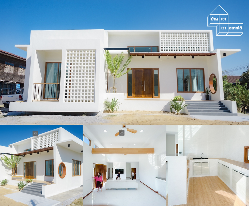 พื้นที่ใช้สอย 180 ตารางเมตร บ้านคุมโทนสีขาว เน้นความโปร่งโล่ง มีช่องให้ลมเข้าช่วยระบายอากาศได้ แถมช่วยเพิ่มดีเทลความสวยงามให้ตัวบ้านได้ด้วย งบประมาณ 2.79 ล้านบาท